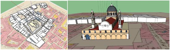 The digital reconstruction process of St. George Church by overlaying historical cartographic documents; the modeling was carried out using SketchUp [].
