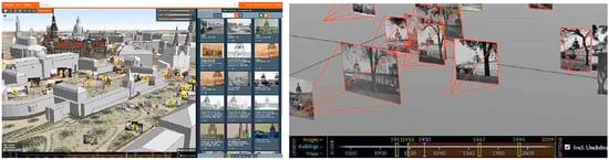 In their study, Dewitz et al. (2019) [], examined the Gothic Sophienkirche in Dresden, Germany, a significant example of 13th-century architecture that survived various interventions until the early 1960s but was later completely demolished. The researchers not only virtually reconstructed this structure but also developed the “Urban History 4D” system, which aims to ensure the sustainability of urban memory in the digital realm. Historical photographs of Dresden were digitally scanned, overlaid with a simplified 3D model of the city map, and systematically analyzed based on their shooting angles and spatial positions (Figure 3).