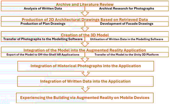 Through these tools, the generated model was experienced across multiple platforms, and the results were evaluated through comparative analysis. The entire workflow was structured into four main stages: archival research, creation of two-dimensional technical drawings, three-dimensional digital modeling, and integration with augmented reality applications. The table below (Figure 10) summarizes the key components of this process along with the digital tools utilized.
