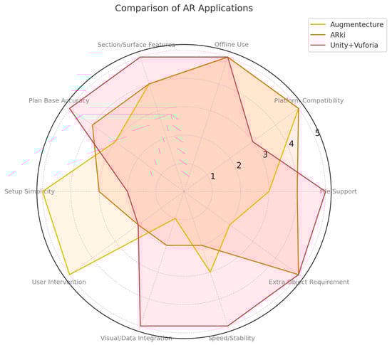 To synthesize the comparative results, a radar chart was generated to visualize the relative strengths and weaknesses of the three AR applications across multiple criteria (Figure 16). As illustrated, the Unity + Vuforia prototype demonstrated superior performance in plan alignment, stability, and data integration, whereas Augmentecture excelled in setup simplicity and accessibility. ARki offered intermediate results with notable flexibility in platform compatibility but limitations in stability. This comparative visualization reinforces the argument that while commercial tools remain valuable for rapid deployment, the proposed prototype provides a more sustainable and comprehensive solution for architectural heritage documentation.