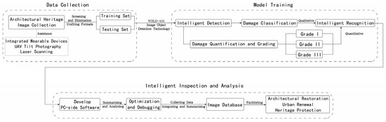 The damage detection framework for architectural heritage developed in this study focuses on visual deep learning technology. It integrates cross-material damage classification standards with multi-modal data processing techniques to form an intelligent system that spans the entire process from data collection to model training and intelligent analysis. This provides a data-driven scientific solution for architectural heritage preservation. As illustrated in Figure 1, the framework consists of three core modules that are closely aligned with the cross-material damage classification system, addressing the subjectivity and single-material assessment limitations inherent in traditional manual detection methods.