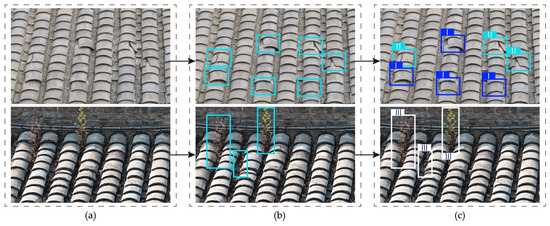 Visualization of annotation and grading methodology for roof tile deterioration: (a) input photographs; (b) damaged area identification; (c) damage severity grading.