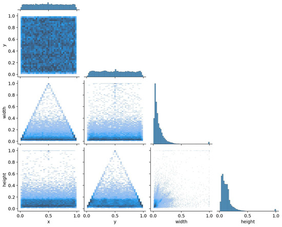 To ensure the effectiveness and generalizability of the damage detection method for architectural heritage, a rigorous selection process was employed to curate 4581 images. These images were systematically divided into a training set comprising 3339 images and a test set containing 1242 images, thus providing robust data support for model training and evaluation. During the damage detection procedures applied to the training set images, an in-depth analysis was conducted on the positional and dimensional distribution characteristics of the targets. As shown in Figure 5, the top-left subgraph presents a two-dimensional coordinate (x, y) distribution of damage targets within image space, highlighting the extensive and diverse scene coverage of the training set. The bottom subgraphs illustrate the correlation distribution of width, height, and (x, y) coordinates, as well as one-dimensional histograms of width and height, systematically revealing the size characteristics and distribution patterns of damage targets. These visual analyses indicate that the post-detection images from the training set exhibit varied positional and dimensional attributes, encompassing spatial layout features of different material types such as wood, brick, stone, and tile structures, along with instances of multi-scale damage. The comprehensive and representative nature of this dataset is ensured by meticulous damage detection and detailed distribution feature analysis within the training set images.