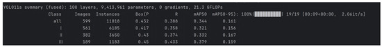 The experiment employed the YOLOv11 model as the base detection model, with its structure and initial detection performance illustrated in the accompanying figures. The model integrates into a 100-layer network comprising 9,413,961 parameters and requires 21.3 GFLOPs for computation. Average inference time per image is 35.6 ms. In terms of detection performance metrics, Box (P) indicates bounding box precision, while Box (R) signifies bounding box recall. The statistical results show an overall precision rate of 0.432, a recall rate of 0.388, mAP50 of 0.344, and mAP50-95 of 0.161 across all categories. Specifically, for Class I (Mild Deterioration), the precision is 0.417, recall is 0.358, mAP50 is 0.321, and mAP50-95 is 0.156. For Class II (Moderate Deterioration), the precision is 0.43, recall is 0.374, mAP50 is 0.332, and mAP50-95 is 0.167. For Class III (Severe Deterioration), the precision is 0.45, recall is 0.433, mAP50 is 0.379, and mAP50-95 is 0.159. These data delineate the model’s initial performance characteristics in architectural heritage damage detection tasks, providing essential baselines for subsequent experimental configurations, comparative model performance evaluations, and ablation studies.