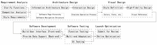 The development of the PC-based intelligent detection system adhered rigorously to a comprehensive technical methodology [27], ensuring optimal functionality, usability, and stability. As depicted in the “Software Design Workflow” diagram, the system’s development initiated with requirements analysis, proceeded through architecture design, visual design, software development, and testing, concluding with store listing optimization. This sequence established a coherent development chain (Figure 9).