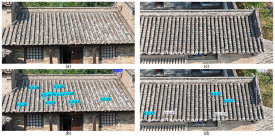 Tile roof degradation analysis at Shangzhuang Village, Shanxi: (a) on-site photographed example 1 of tile roof; (b) software processing output result for tile roof example 1 photo; (c) on-site photographed example 2 of tile roof; (d) software processing output result for tile roof example 2 photo.
