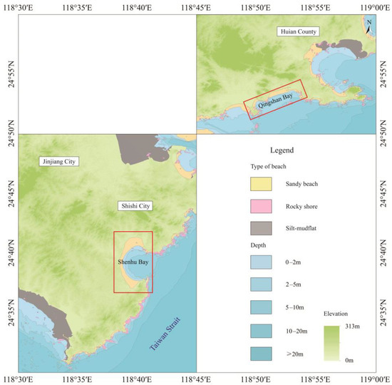 The study area is located between 24°22′–25°56′ N latitude and 117°34′–119°05′ E longitude, with the altitude mostly ranging from 10 to 100 m. The sandy beaches are mainly distributed in the 0–10 m altitude zone. The area is characterized by a subtropical maritime monsoon climate, with an average annual rainfall of approximately 1000 mm. The rainfall intensity is highest from July to August and lowest from November to January of the following year, with significant interannual variations in precipitation. The tides in the study area are of the regular semidiurnal tide type. The tidal currents are rectilinear currents, with the flow direction within coastal bays generally consistent with the trend of the bays. In the waters of the Taiwan Strait outside the coastal bays, the flood and ebb current directions are nearly northeast–southwest, which is basically consistent with the trend of the bathymetric contour lines. In the strong tide area, the tidal range is significant, with a maximum tidal range of approximately 6.52 m, an average tidal range of 4.23–4.52 m, and a minimum tidal range of approximately 1.9 m. The annual prevailing wind direction and wave direction are mainly north–northeast (NNE), northeast (NE), and south-southwest (SSW) The coastal sandy soils in the study area are mostly medium sand and fine sand, partially containing coarse sand gravel and quartz particles, and often contain biogenic debris.