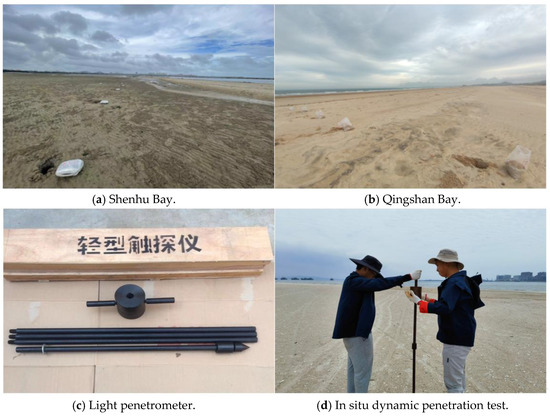However, most existing research has focused on standard or river sands, with limited data on coastal sandy soils containing biogenic debris (sand-sized particles of biological origin, primarily including fragmented shells, coral remains, and other calcareous skeletal materials. These components are typically angular to sub-angular with a high calcium carbonate content, which can modify particle shape, surface roughness, and pore structure, thereby influencing soil density, permeability, and shear strength) and salt, and a lack of comprehensive in situ testing. Ref. [28] investigated the load response and soil displacement field for a vertically loaded half-strip footing in sand, providing further insights into conventional quartz sand behavior under controlled conditions, which contrasts with the more complex nature of coastal bioclastic sands. To date, no systematic study has been reported on the physical–mechanical properties of sandy soils in the Quanzhou coastal zone. Thus, this study selects Quaternary residual sands from the beaches of Shenhu Bay and Qingshan Bay to systematically investigate their physical and mechanical properties and relationships to foundation bearing capacity, using in situ testing, laboratory experiments, and theoretical modeling. The results aim to support safe building foundation design for coastal engineering projects in Quanzhou and similar regions.