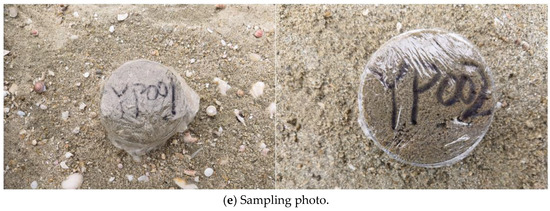 After completing the bearing capacity tests in the field, sand samples were excavated from a depth of 30 cm below the surface at different beach locations for laboratory mechanical property tests. To ensure the representativeness of the test results, the sampling areas in this study covered different positions along coastal beaches and shore zones, including the nearshore, foreshore, and inland depositional environments. Sampling Points 1–8 were located in Shenhu Bay, and Points 9–15 were located in Qingshan Bay. The geological conditions of the sampling points varied significantly, as follows: Point 1 was located in the nearshore area, where the beach surface was moist and stratification was observed in the subsurface soil; shallow footprints were left after stepping, and the sample was poorly graded medium sand. Point 2 was situated between the nearshore and the foreshore, with a water layer covering the surface; deep footprints were formed during sampling, and the pit collapsed easily; the sample was poorly graded fine sand. Point 3 was close to the shoreline, where the soil exhibited distinct stratification; the surface was moist and relatively firm, and the sample consisted of poorly graded medium-fine sand. Point 4, farther from the shoreline than Point 3, yielded fine sand samples; dynamic penetration test results indicated a density approximately twice that of Point 3, though the gradation remained poor. Points 5 and 6 were located in a dry sandy gravel area farther inland, where no footprints were left after stepping and no stratification was observed; the samples were poorly graded fine sands. Point 7, distributed parallel to Point 6, showed noticeable footprints after stepping, with no stratification observed, and the sample was poorly graded. Point 8 was sampled after ebb tide, where the surface was moist, footprints were deep, and the sample was poorly graded medium sand. Point 9 was located near the estuary of Qingshan Bay, with the surface covered by water; shallow footprints formed after stepping, and the sample was poorly graded medium sand. Points 10–15 were distributed in the coastal and inland zones of Qingshan Bay; the samples were generally poorly graded, mostly medium sand, with occasional coarse gravel and quartz particles; the surfaces were predominantly dry, and no obvious footprints were observed after stepping. Point 15 was approximately the same distance from the shoreline as Point 13-2.