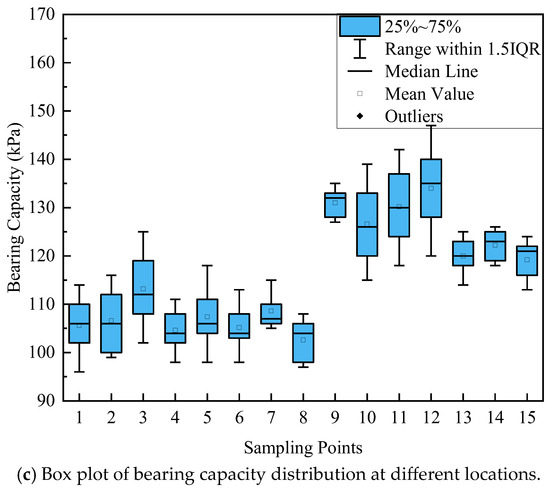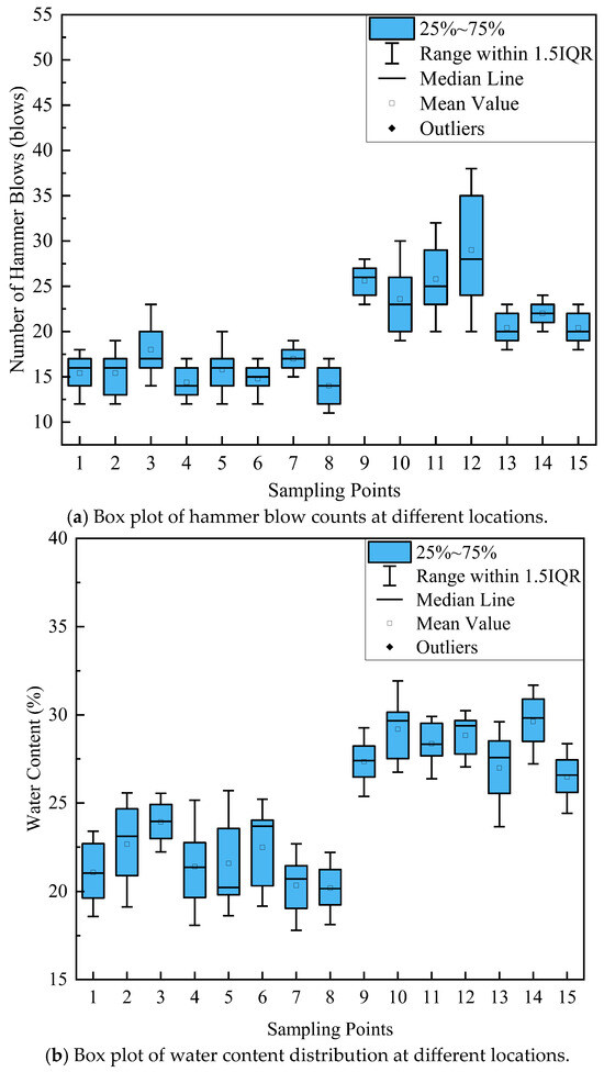 Box Plots of Water Content and Bearing Capacity Distributions at Different Locations for Beach Sandy Soils.