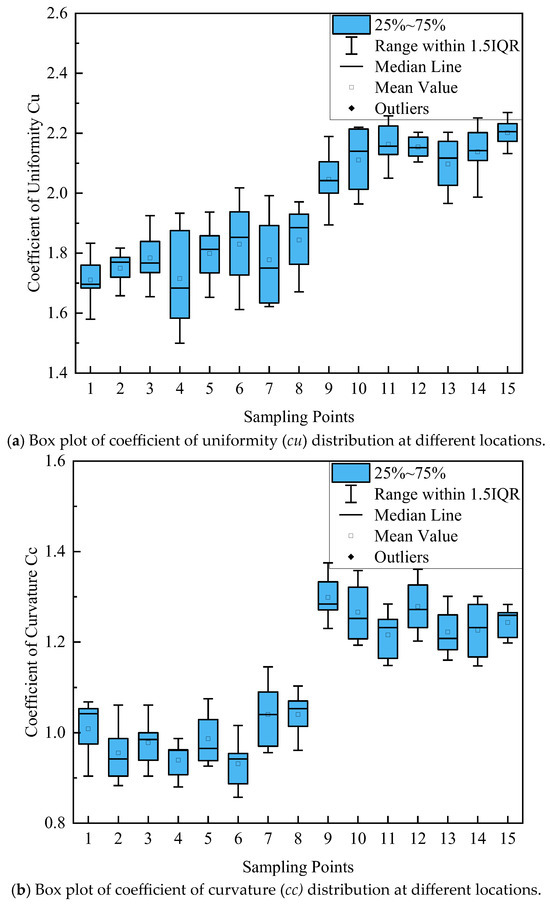 Box plots of particle size gradation distributions at different locations for beach sandy soils.