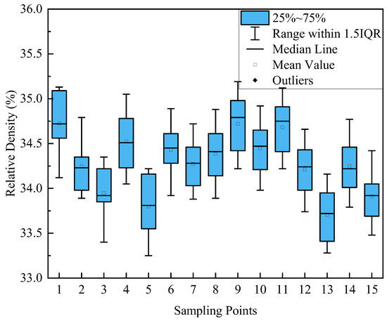 Box plot of relative density distribution at different locations for beach sandy soils.