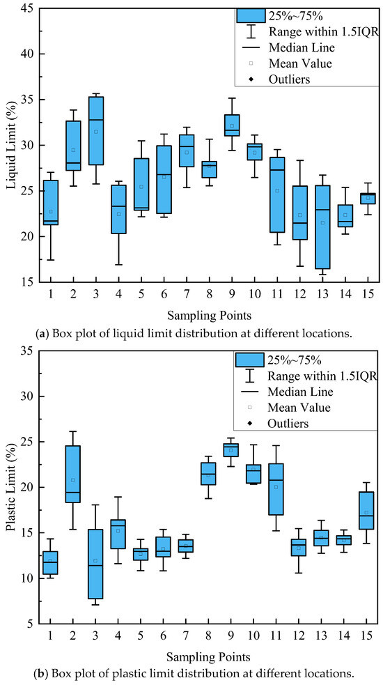 Box plots of liquid limit and plastic limit distributions at different locations for beach sandy soils.