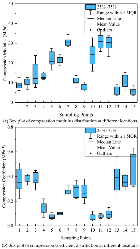 Box plots of compression modulus and compression coefficient distributions at different locations for beach sandy soils.