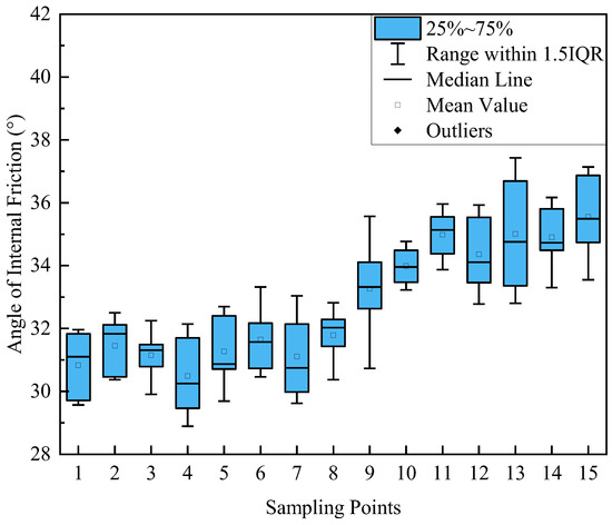 Box plot of angle of internal friction distribution at different locations for beach sandy soils.
