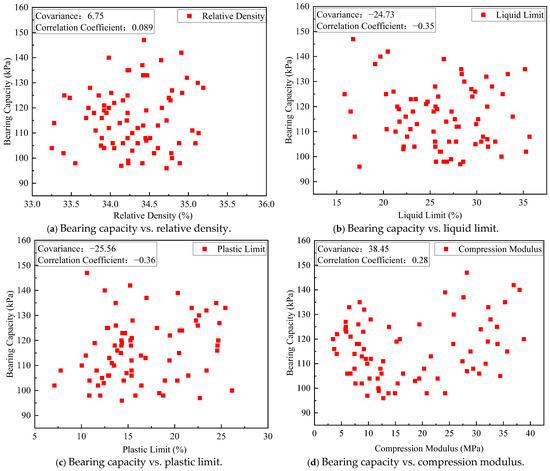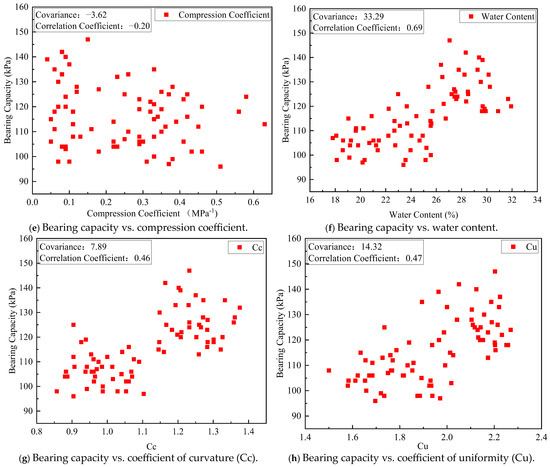 Figure 10 plots the relationships between different mechanical indices and foundation bearing capacity. Meanwhile, the covariances and correlation coefficients between each mechanical index and foundation bearing capacity were calculated. As can be seen from the figure, the relative density, liquid limit, plastic limit, compression modulus, and compression coefficient show weak correlations with foundation bearing capacity, with covariances of 6.75, −24.73, −25.56, 38.45, and −3.62, respectively; the correlation coefficients are 0.089, −0.35, −0.36, 0.28, and −0.20, respectively. The water content and particle gradation parameters Cc, Cu exhibit correlations with foundation bearing capacity, with covariances of 33.29, 7.89, and 14.32, respectively. The correlation coefficients are 0.69, 0.46, and 0.47, respectively, which falls within the medium correlation range, indicating this correlation is highly unlikely to be caused by random errors in a probabilistic sense, and thus holds practical significance for research.