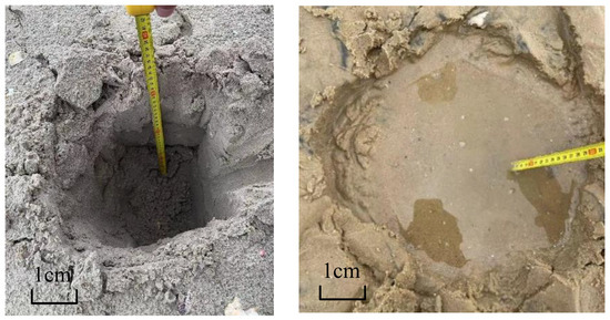 During on−site sampling, it was observed that water content has a significant impact on the bearing capacity of sandy soil, which is intuitively reflected in the depth of footprints on the beach. The depth of footprints varies across blocks with different water contents, and soil collapse was observed in pits after sampling in some high-water-content areas (as shown in Figure 11). As can be seen in Figure 10, the foundation bearing capacity increases to a certain extent with an increase in water content. However, when the water content is the same, the bearing capacity values are diverse. According to the test results of other physical and mechanical properties at the sampling points, it is speculated that this difference is caused by particle gradation. It can currently be inferred that there is a positive correlation between water content and bearing capacity, especially within a certain range of water content, where the bearing capacity of sandy soil gradually increases with an increase in water content. In the water content range of 17.8–24.92% (average water content 21.33%), the average bearing capacity is 107.41 kPa; in the range of 25.15–31.92% (average water content 27.98%), the average bearing capacity is 123.97 kPa.