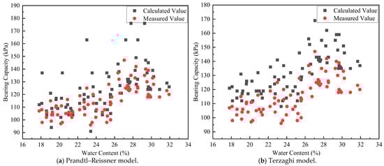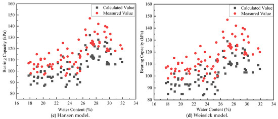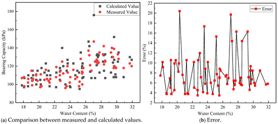 The correctness of the proposed foundation bearing capacity model was validated using in situ bearing capacity data. Figure 15a shows a comparison between the bearing capacity values calculated by the field model and the in situ-measured bearing capacity values. Since the foundation bearing capacity was obtained via dynamic penetration on-site without considering the width of the foundation base, the foundation base width b in the formula was fitted as an unknown variable. As can be seen from the figure, the measured bearing capacity values in the coastal zone are generally consistent with the calculated values from the theoretical model. Between a water content of 0 and 0.33, the theoretical calculations and measured bearing capacity increase with increasing water content. Physical and mechanical tests have shown that a water content of 0.33 is the critical point where the soil transitions from a “dry” to a “saturated” state. At this water content, the interparticle forces and pore water pressure in the soil reach equilibrium; further water addition does not significantly improve the bearing capacity and may instead cause it to decline. Therefore, 0.33 can be regarded as an approximate value for the soil’s saturated water content. The error for most points is less than 10%, with an average error of 15%. However, at certain points, the errors are larger—for example, at water contents of 20.32%, 23.56%, 25.15%, 27.05%, 27.21%, 27.78%, 28.52%, and 29.26%, the bearing capacity errors are 20.41%, 17.35%, 15.31%, 19.73%, 14.4%, 16.30%, 14.4%, and 16.30%, respectively. These errors show no discernible pattern and may be caused by on-site measurement errors. The lack of standardization in the manual operation during the on-site test and systemic error of the dynamic penetration test (DCT) make field-measured bearing capacity inaccurate. On the other hand, proposed model does not consider other factors, such as the liquid and plastic limit or relative density. The predicted bearing capacity value of the proposed model is not inaccurate. In order to improve the accuracy of the proposed model, field bearing capacity measurement and laboratory tests should be expanded. As shown in the error plot in Figure 15b, the error of the theoretical model tends to decrease slightly with increasing water content. The main reason for this is that at higher water contents, the calculation of the friction angle in the theoretical model is more accurate, leading to increased reliability of the theoretical model as the water content increases.