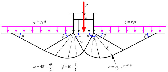 The Prandtl–Reissner model assumes a perfectly smooth foundation base and uses characteristic lines to derive the failure mode (as shown in Figure 13) and the ultimate bearing capacity calculation formula: