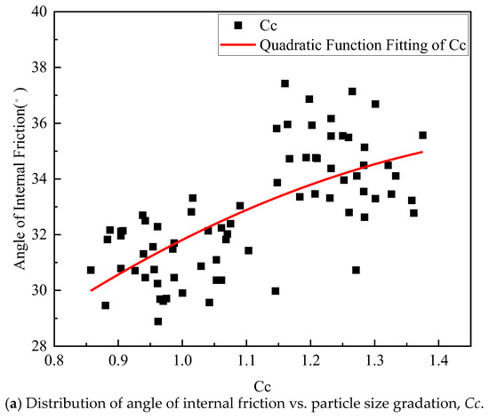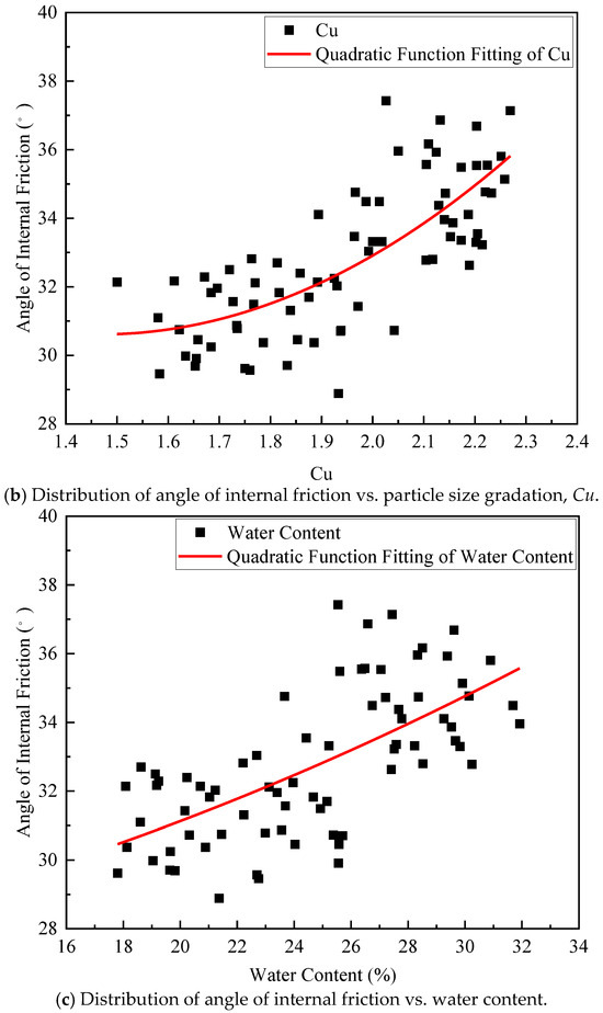 Equation (11) considers the effects of the angle of internal friction and foundation embedment depth. Since the angle of internal friction is a mechanical parameter inherent to the sandy soil, it needs to be determined through precise laboratory mechanical tests. To rapidly determine the angle of internal friction of sandy soil in the field, an attempt was made to establish a relationship between the angle of internal friction and water content as well as gradation coefficients. Figure 14 shows the relationship between the angle of internal friction ϕ and Cu, Cc, and water content. As can be seen from the figure, Cu and Cc show a positive correlation with φ. When Cu increases by 0.769, φ increases by 5°; when Cc increases by 0.518, φ increases by 4.84°. Water content also shows a positive correlation with φ: when the water content increases by 14.12%, it increases by 4.34°. Their relationship was fitted to obtain the expression for the angle of internal friction φ: