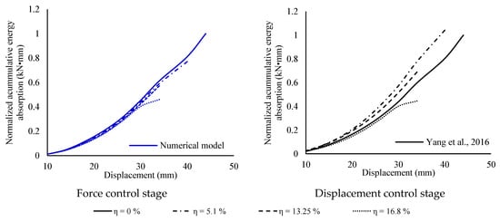 | Energy absorption (kN∙mm) | 14,861.0 | 15,055.0 | 1.3 | 14,947.1 | 11,748.0 | 21.4 | 11,145.9 | 8684.0 | 22.1 | 7407.0 | 6890.0 | 7.0 |