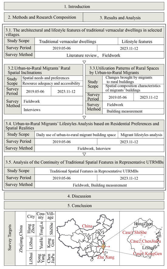 Figure 1 illustrates both the structural composition of the paper and the geographical location of the research sites. Specifically, in the results and analysis section, our field investigation and analytical work are organized into five subsections, each outlining the research scope, survey period, and methodological approach.