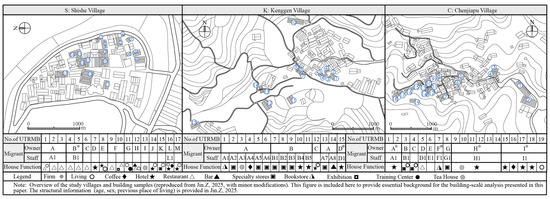 13]. We first conducted interviews with these migrants to gather information on their spatial preferences for rural living, the renovations or modifications they made to the buildings prior to moving in, and their current daily life practices. Following the interviews, on-site investigations were carried out on the corresponding buildings. Spatial information was documented through detailed measurements and architectural drawings, providing the empirical foundation for analyzing the spatial characteristics of urban-to-rural migrants’ buildings (UTRMBs) in the context of urban-to-rural migration. Drawing upon the collected data, we employed a combination of qualitative typological analysis and quantitative spatial assessment to examine migrants’ spatial preferences, architectural transformations, and the compositional features of UTRMBs.