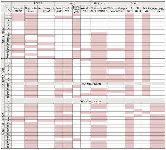 Section 3.1 identified key spatial characteristics of vernacular buildings in the studied villages, such as central courtyards, axial symmetry, inward-facing layouts, and spatial gradation from public to private. These features are taken as the baseline criteria for evaluating the extent to which migrant-built or renovated dwellings align with, reinterpret, or depart from local traditions.