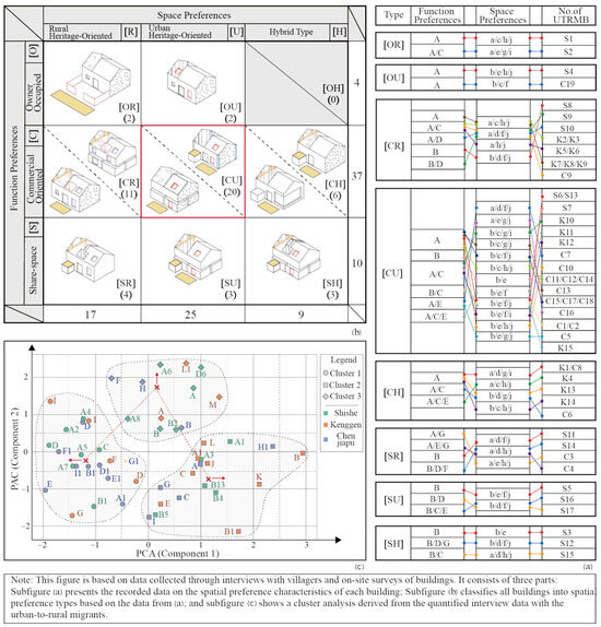 Figure 12b presents a cluster analysis based on the presence or absence of these activities within each UTRMB, coded as 1 or 0, respectively. The results yield five distinct clusters across the 51 buildings: (1) Basic Reception Type, (2) Standard Guesthouse Type, (3) Social–Service Hybrid, (4) Creative–Public Space, and (5) Handcraft–Creative Type. The distribution of cases is relatively balanced, though Types (1) through (3) are more prevalent. Notably, no examples of Type (4) were found in Kengen Village, and Type (5) was absent in Shishe Village, suggesting spatial and cultural limitations in supporting more community- or creativity-oriented practices.
