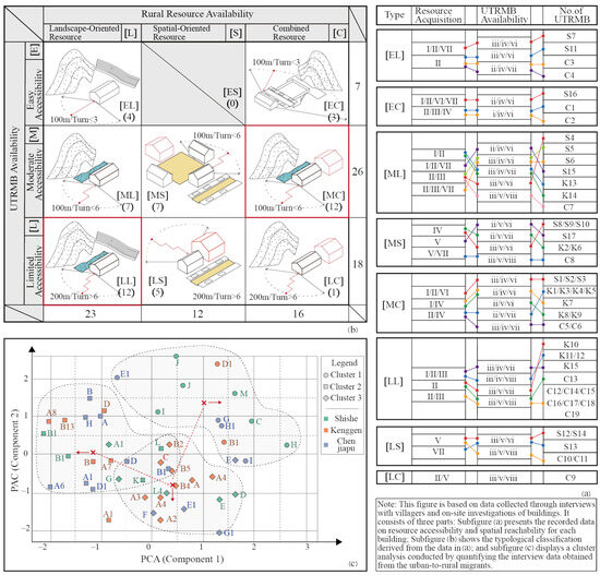Figure 9c, the clustering results revealed three distinct groups: Cluster 1 includes individuals with both high accessibility and strong engagement with rural resources; Cluster 2 represents respondents with generally limited access to such resources; and Cluster 3 consists of those with good access to natural resources but relatively weak connectivity to communal rural spaces. In the PCA, the first principal component reflects the degree to which migrants prioritize engagement with traditional rural environments, while the second represents a value orientation continuum between naturalistic immersion and built-environment convenience. Notably, the results show that UTRMB residents from the same village are distributed across different clusters, indicating that spatial preference is not solely determined by geographic location within the village. Instead, individual factors—such as personal background, values, and lifestyle choices—play a more decisive role in shaping residential behavior and spatial selection.