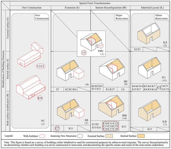 Figure 10, morphological adaptation is categorized into four distinct types: complete reconstruction, extension, internal spatial reconfiguration, and preservation of the original layout. Correspondingly, interface articulation is classified into three types: exterior surface renovation, interior surface renovation, and combined renovation of both interior and exterior surfaces. A cross-analysis of these two dimensions yields nine spatial transformation scenarios, which are further grouped into three overarching categories: newly constructed spaces, partially renovated spaces, and spaces that retain their original configuration. Among these, only two cases involve entirely new constructions—both located on the peripheries of Kengen Village and Chenjiapu Village, respectively—and are used for commercial purposes as guesthouses. Their peripheral placement, outside the core heritage preservation zones, reflects both regulatory constraints and strategic locational choices negotiated by the migrants. More importantly, these transformation types reflect varying levels of migrants’ engagement with traditional spatial values—ranging from preservation to reinterpretation and replacement. The most common scenario involves the preservation of the original building layout accompanied by selective interior surface renovation. This approach suggests an economically pragmatic strategy adopted by many urban migrants during resettlement, as it minimizes renovation costs while meeting basic spatial needs. Such strategies also reflect an intent to balance modern comfort with traditional spatial patterns, especially among migrants who value cultural continuity. Notably, several buildings—such as C1, C2, C3, C10–C18, and K10—were designed and constructed with the involvement of professional architects. In contrast, the remaining cases were adapted by local craftsmen under the guidance of the migrants themselves. While the former group tends to demonstrate conscious design interventions, the latter often reveals spontaneous yet meaningful acts of spatial preservation or adaptation. Nevertheless, many of these latter examples demonstrate a surprisingly high standard of spatial quality. This spatial quality is primarily reflected in the overall performance of these UTRMBs in terms of functionality, comfort, and ambiance. It encompasses the use of local materials and construction techniques, the treatment of spatial decoration, and the conscious response to the rural landscape. In doing so, these buildings not only fulfill everyday living needs but also reveal a sensitivity to local culture, as well as a certain degree of personal aesthetic expression. This observation suggests that urban-to-rural migrants, regardless of professional support, often possess sufficient cultural capital and value-driven motivation to engage with vernacular traditions in creative and context-sensitive ways.