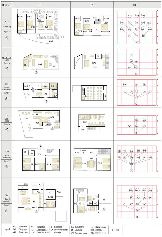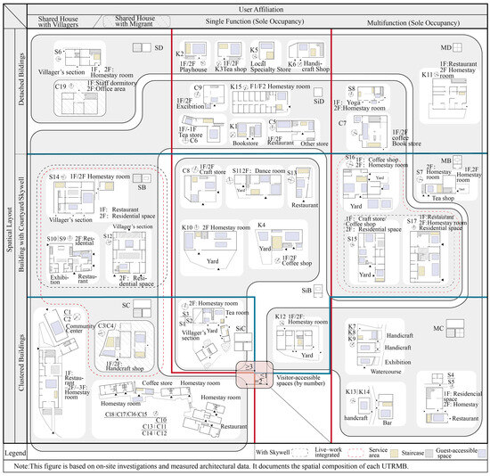Traditional vernacular dwellings in the selected Zhejiang villages exhibit similar spatial characteristics rooted in regional construction logic, including materials, structure, and spatial hierarchy. This shared foundation provides a comparative basis for examining how urban-to-rural migrants reinterpret, appropriate, or diverge from vernacular spatial values in the process of inhabiting and modifying rural spaces. In this section, we present simplified first-floor plans of all surveyed buildings and analyze the spatial composition of UTRMBs from two perspectives: user affiliation and spatial layout, with attention to whether these compositions conform to or transform traditional rural living patterns.
