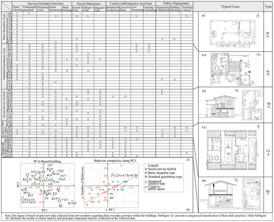 To further examine the underlying structure of spatial behaviors, a principal component analysis (PCA) was conducted on the 15 activity variables. The first principal component (PC1) explains the largest portion of variance and represents the degree of functional complexity within each UTRMB. It reflects the transition from single-purpose uses (e.g., basic reception) to multifaceted arrangements that incorporate service, creativity, and interaction. The second component (PC2) captures the orientation of behavioral emphasis—ranging from outward-facing social connectivity to inward-focused productive or artistic practices. Together, the two components construct a behavioral space that reveals a functional spectrum across UTRMBs. Unlike discrete clusters, this spectrum illustrates a continuum of spatial adaptation, where everyday practices evolve from reception-oriented functions to more diversified forms of living that reshape the architectural roles of rural dwellings.