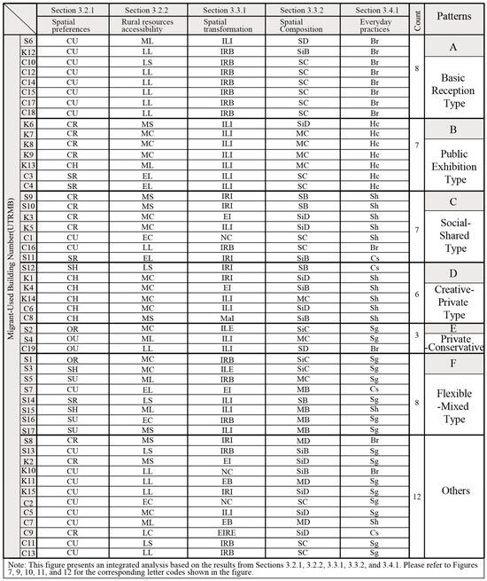 Rather than treating each variable separately, we treat each building as a composite profile reflecting the migrant’s spatial strategies and lifestyle logics. Through comparative analysis of frequency and semantic convergence, we identified recurring combinations that signify coherent ways of inhabiting and reconfiguring village space. Based on this approach, six representative lifestyle types were extracted in