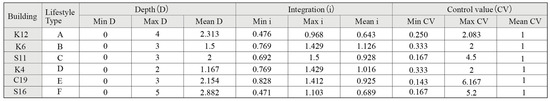 Figure 15 presents the syntactic measures of these representative UTRMBs, comparing depth, integration, and control values to reveal variations in spatial properties among different building types. As illustrated in