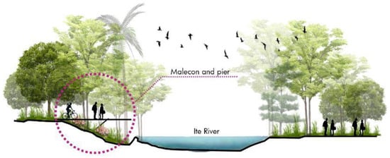 | Infrastructure and Territory | Need for connectivity between riverbank and urban fabric. | Relevance of the area’s topographic conditions. | Lack of adequate sewage network throughout the basin. |