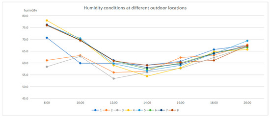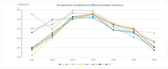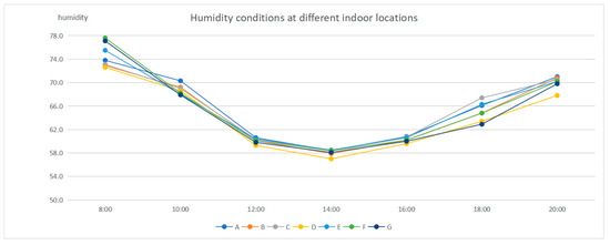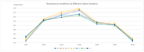 During the summer test, Rucheng was in its hottest month during the test period, with an average outdoor temperature of 31.1 °C. The average outdoor wind speed recorded during the summer test was 1.12 m/s, with instantaneous wind speeds remaining below 1.5 m/s at most measurement points. Indoor wind speeds during the same period ranged from 0 to 0.25 m/s, with first-floor wind speeds predominantly around 0.2 m/s and second-floor speeds approximately 0.05 m/s. These results indicate that airflow within the house was quite slow, particularly on the second floor, where effective ventilation was largely absent. This situation can also be attributed to the residential floor plan: windows were present on the north side, but the hall depth was excessive; no windows were opened on the side walls; and the south- and north-facing windows were small. None of these features created a sufficiently open plane for airflow, resulting in the absence of through-drafts, which is the main cause of the low indoor wind speed. The measured data are presented in Figure 9, Figure 10, Figure 11, Figure 12, Figure 13 and Figure 14.