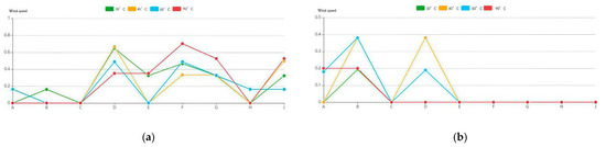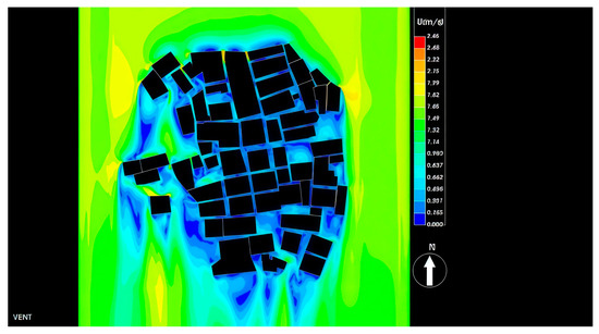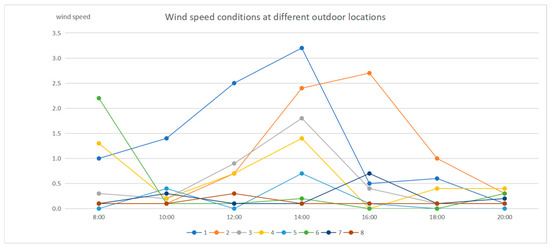 In summer, the local area experiences minimal natural wind at the main entrance of the village despite the dominance of south or southeast winds during summer. Nevertheless, Jinshan Village’s residential area has achieved a favourable ventilation environment through the diversion of water to form ponds, facilitating the combined effects of northward water–land winds and prevailing southeast winds. A rational arrangement of alleys, public green spaces, and building layouts has contributed to effective ventilation. Nevertheless, factors including narrow spacing between buildings, considerable building depth, and dense row-style layouts diminish the overall ventilation effectiveness, as illustrated in the Figure 15, Figure 16, Figure 17, Figure 18 and Figure 19 and Table 2.