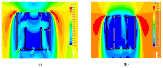 Wind speed cloud diagram of current ventilation situation of single building, (a) 1F; (b) 2F.