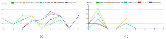 Wind speed comparison chart of opening windows of one floor, (a) 1F; (b) 2F.