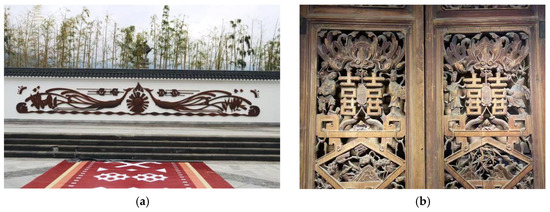 Decorative patterns in architectural spaces of She ethnic areas. (a) Photographed in Jingning She Autonomous County, Zhejiang province, China. (b) Photographed at the She Ethnic Folk Museum, Banyue Village, Xiapu County, Fujian Province, China; the gate is decorated with the Chinese character “囍” (shuangxi, meaning “double happiness” and symbolizing marital joy).