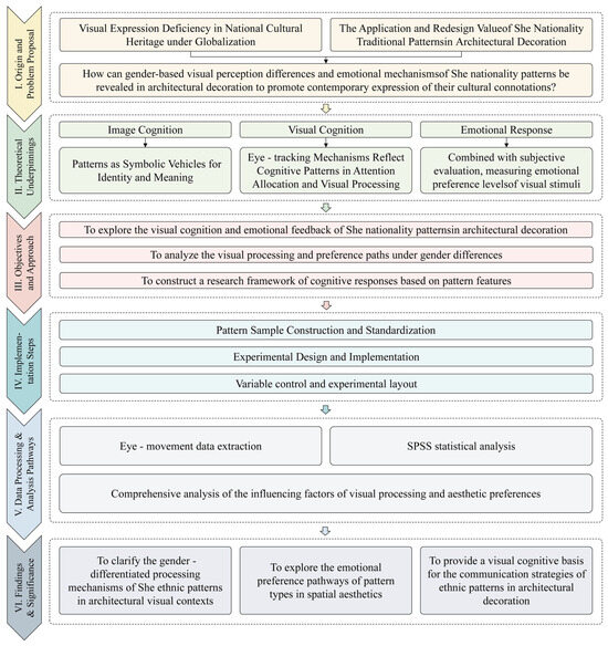 To address these methodological limitations, this study introduces a multimodal perceptual framework combining eye-tracking technology with subjective assessment methods. Eye-tracking technology can provide objective measurements of visual attention that are not subject to conscious control, capturing automatic visual behaviors that occur within the first few hundred milliseconds of perception—precisely the critical moment when cultural identification and emotional arousal are initiated. Unlike traditional survey methods that rely on subjective recall, eye-tracking can record attention allocation, gaze patterns, and pupil responses in real-time, directly reflecting cognitive load and emotional engagement levels. By combining objective physiological measurement data with subjective semantic differential assessments, this multimodal approach can simultaneously explore the patterns of implicit cognitive mechanisms and explicit aesthetic preferences, enabling researchers to identify potential differences between unconscious visual behaviors and conscious cultural judgments. Based on this innovative framework, this study provides scientific evidence for the modern application of ethnic cultural patterns, promoting their precise dissemination and effective adaptation in global architectural contexts (The research path is shown in Figure 2).
