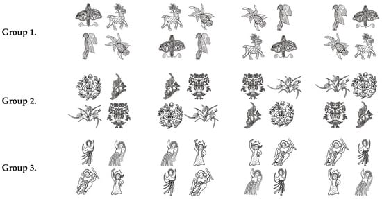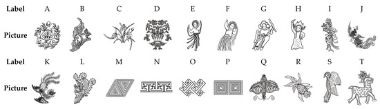 Based on ethnographic fieldwork conducted in She ethnic enclaves, this study systematically collected primary traditional pattern resources through a triangulated approach integrating gazetteers, genealogical archives, museum collections, and academic publications. The amassed motifs were categorized and systematized into five typological groups: zoomorphic, phytomorphic, anthropomorphic, geometric, and totemic motifs. Four representative specimens from each category (totaling twenty motifs) were selected to construct the stimulus sample set(as shown in Figure 4). To minimize potential confounding effects from textural and chromatic variables on cognitive evaluation, all original patterns were digitally converted into monochromatic line drawings with well-defined contours using Adobe Illustrator CC 2024, ensuring standardized visual stimuli for experimental protocols.