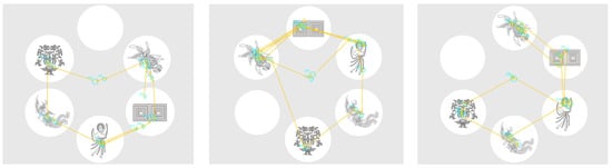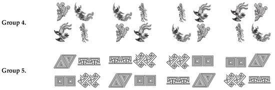 The 20 patterns are evenly distributed into five groups (four patterns per group) based on category. Following the classic experimental design approach, a Latin square arrangement is employed to balance the screen placements, ensuring each pattern is equally presented in the four cardinal directions of left, right, up, and down. This results in five sets of spatially balanced stimulus materials, as depicted in Figure 5.