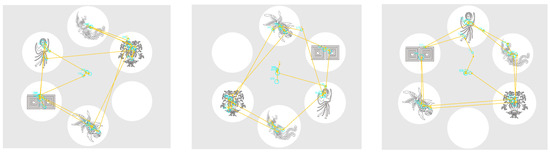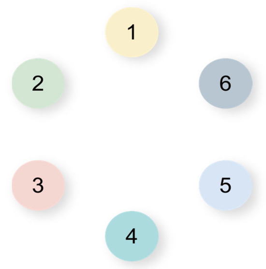 Based on the results of the first round of experiments, five types of high-attention patterns were selected, along with a blank control image, to form six groups of stimuli. To achieve a multilevel experimental design, the principle of the Latin square design was utilized to adjust the spatial arrangement, arranging the six samples in a circular layout. Each pattern corresponds to the positions of 2, 4, 6, 8, 10, and 12 o’clock on a clock face, with six independent analysis areas delineated (as shown in Figure 6).