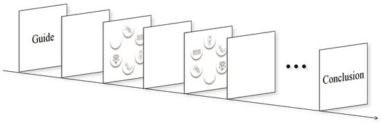 The study comprises two phases: the eye-tracking experiment and the subjective evaluation. The eye-tracking experiment consists of two independent tests, with the entire experimental design and execution utilizing a USB dongle to ensure the security of data collection and analysis. In the first experiment, participants view an instruction interface for 4 s, followed by the free observation of 20 randomly arranged sets of She ethnic patterns (resolution 1024 × 768 pixels), each displayed for a fixed duration of 6 s. After each pattern is shown, the system automatically switches to the next image; a closing message is displayed at the end of the experiment, completing data collection for the current participant (as shown in Figure 7). In the second experiment, maintaining the same duration for the instruction, stimulus presentation time, and equipment parameters, the patterns are replaced with high-attention samples selected from the first experiment, with additional blank interference images added as a control (process shown in Figure 8). To prevent interference from the visual persistence effect, a 0.5 s blank screen interval was used in both experiments to transition between stimulus patterns. Additionally, a standardized calibration procedure was conducted before the experiment to ensure the accuracy and precision of the eye-tracking equipment.