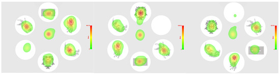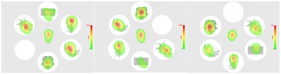 A gaze heatmap is a visualization analysis technique based on eye-tracking data that presents the attention distribution characteristics of participants on the visual interface using a heat spectrum. As shown in Figure 11 and Figure 12, the color temperature gradient transitions smoothly from warm tones (red/orange) to cool tones (green), reflecting the intensity of visual cognition resource allocation and the priority of information processing. High-density hotspot areas often show a strong correlation with key decision elements or design focus points in the interface, providing important reference points.