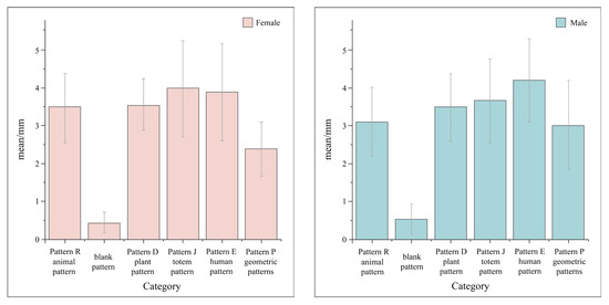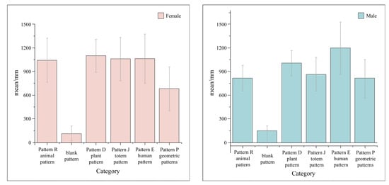 In the analysis of fixations, the homogeneity of variance test results for the male group satisfied the conditions for parametric testing (p = 0.144 > 0.05), so ANOVA was conducted. The results indicated that the pattern type had a significant main effect on the number of fixations (F(5, 60) = 5.892, p < 0.001). For the female group, due to the non-homogeneity of variance (p = 0.012 < 0.05), the Kruskal–Wallis test was applied, and the results were also significant (H(5) = 32.574, p < 0.001).Results are shown in Figure 16 and Table 4.