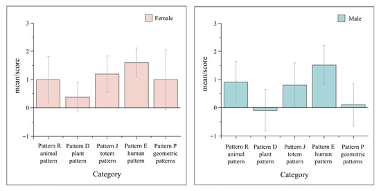 Despite some differences in pattern ratings between males and females, both genders show significant commonality in overall aesthetic trends: the totem pattern received the highest preference ratings from both male and female groups, while the geometric pattern received lower ratings from both genders, with males in particular rating the geometric pattern significantly lower than other patterns.