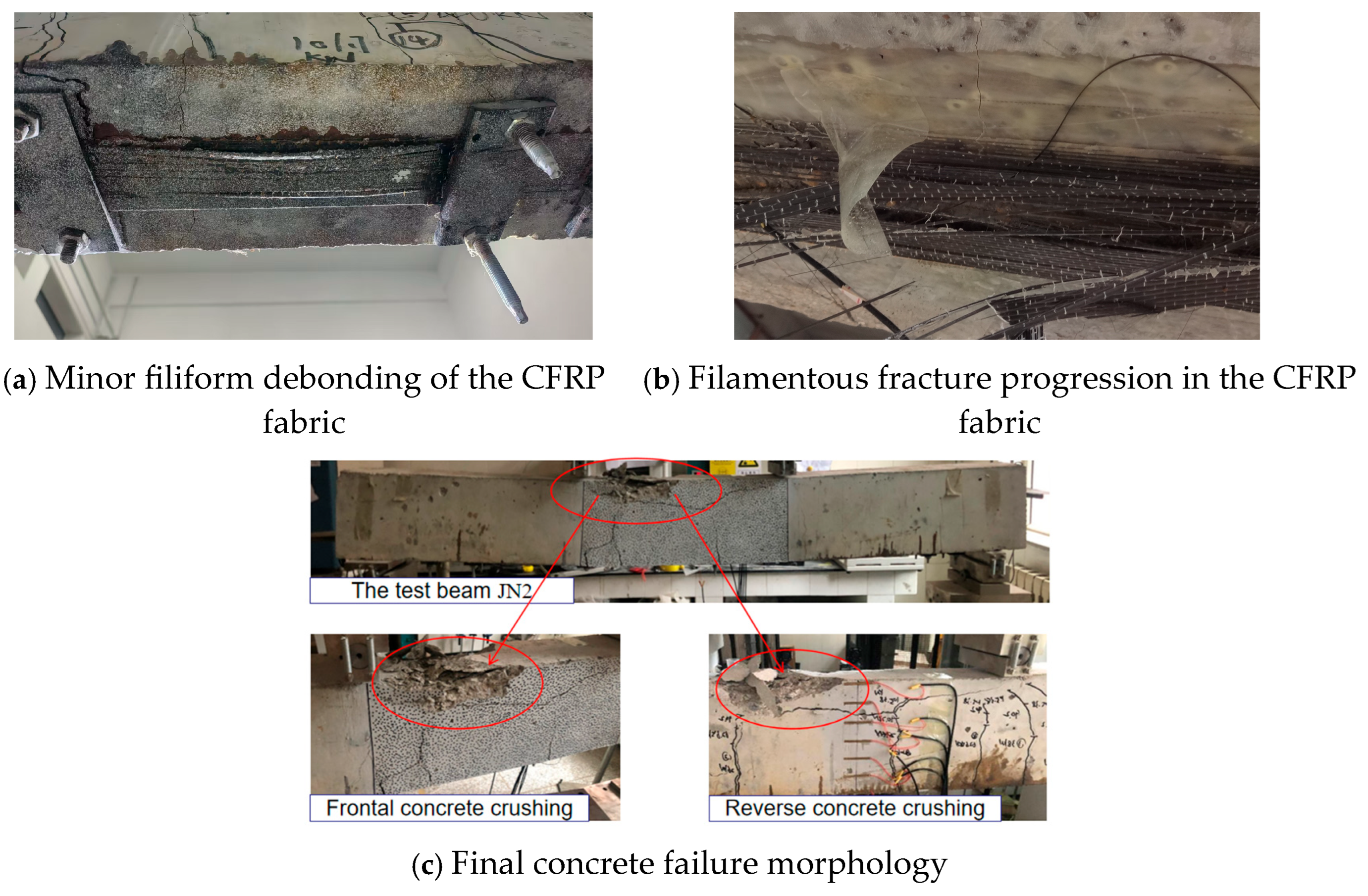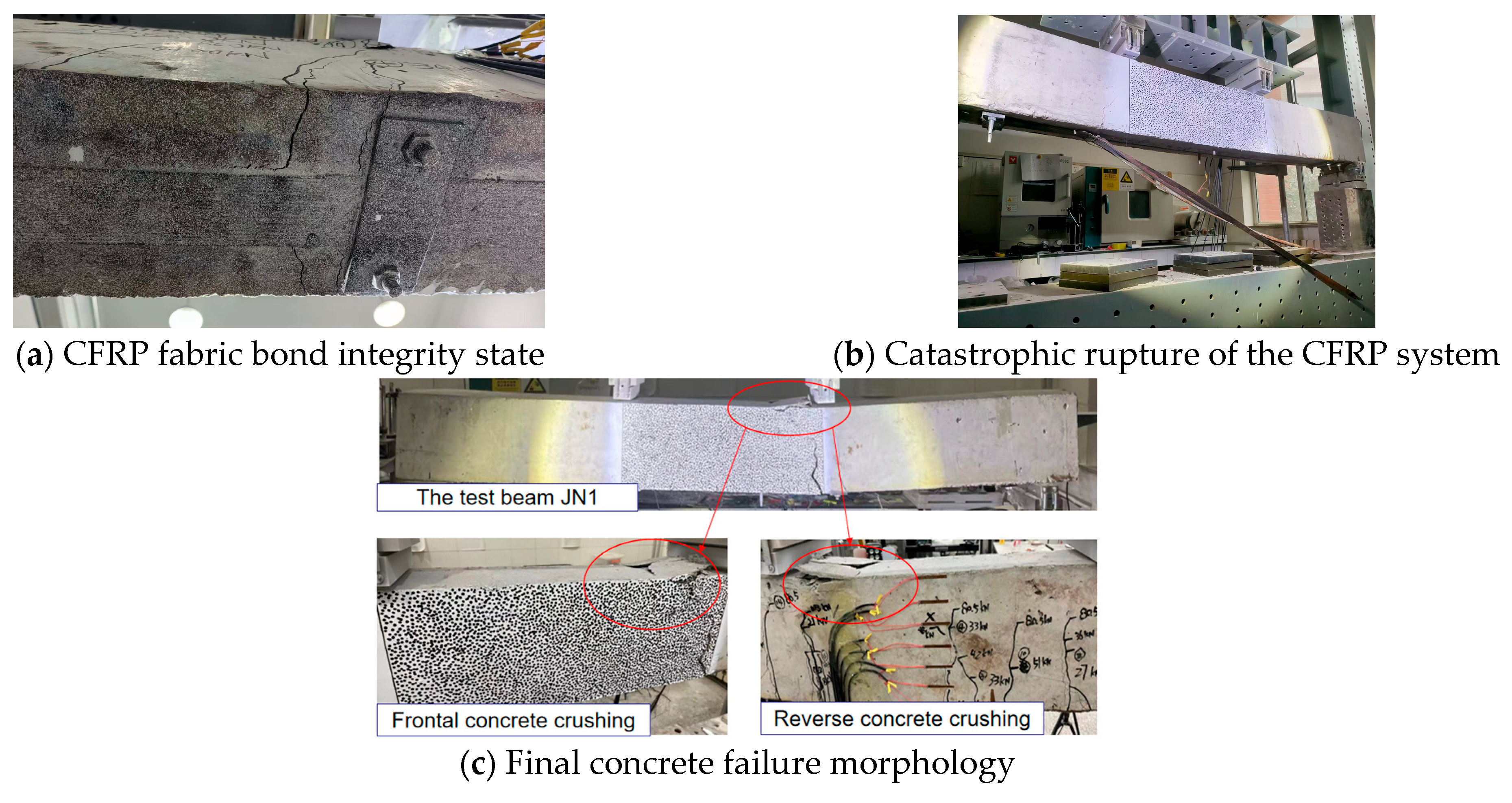 - Given that this study has not yet fully revealed the microscopic mechanisms of interfacial failure in multi-layer CFRP strengthening, future work should incorporate micro-characterization techniques such as SEM/XCT [37,38]. This will enable the quantitative analysis of interfacial shear stress distribution, crack propagation, and bond degradation laws. A predictive model for the “layer number–stiffness–delamination threshold” should be established to achieve a breakthrough beyond the current layer limitation.